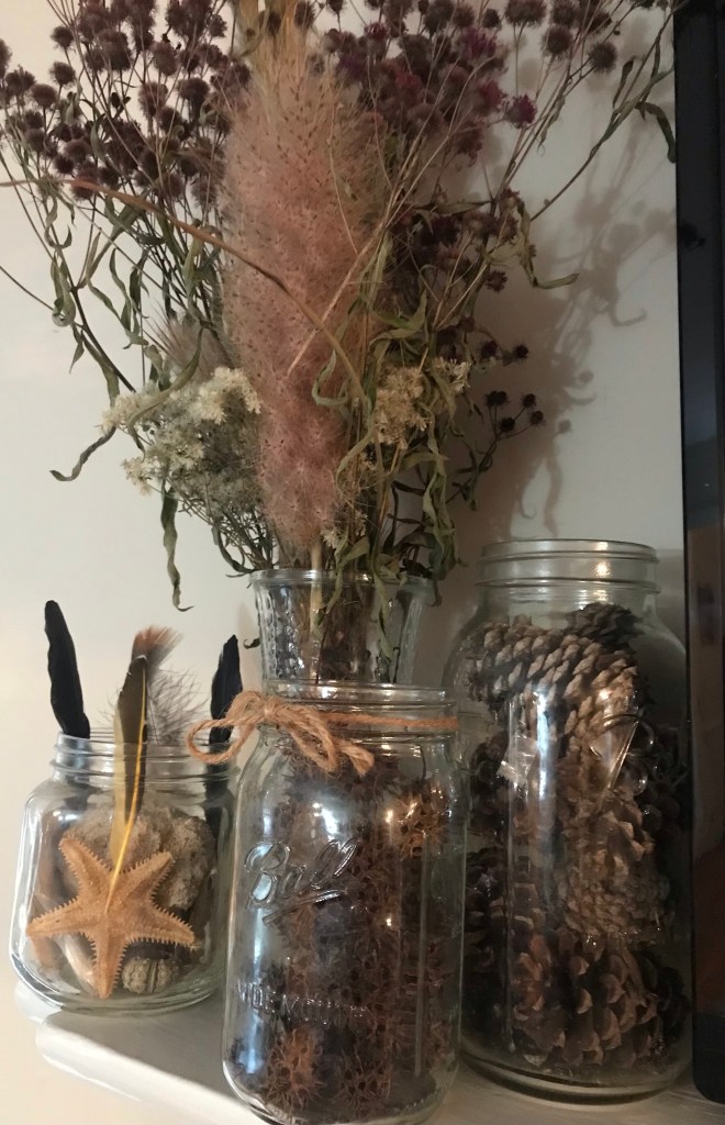 If you know me, you know I’m creative but in very quirky ways. My mother on the other hand, can draw a master piece with a #2 pencil, as can my brother and at least 2 of my children and 2 of their cousins. Drawing, painting, decorating is not really my thing. I like to decorate with my “treasures” which consist of different types of pine cones from different species of pines, acorns from different species of oaks, sea shells, barnacles, coral and other sea treasure from our adventures to the coast, tumbleweeds, antlers, random cool rocks and pretty feathers. I also like glass as it holds and displays my many treasures! God has already created these things and they are so unique and beautiful.