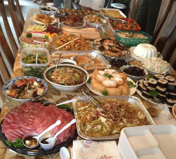 We had sugar-cured ham with a drizzle of honey, green-bean casserole, peach cobbler, fried okra, mini ham sandwiches on poppy-seed sweet rolls, buttermilk fried chicken, and every other assortment of mouthwatering food you can imagine.