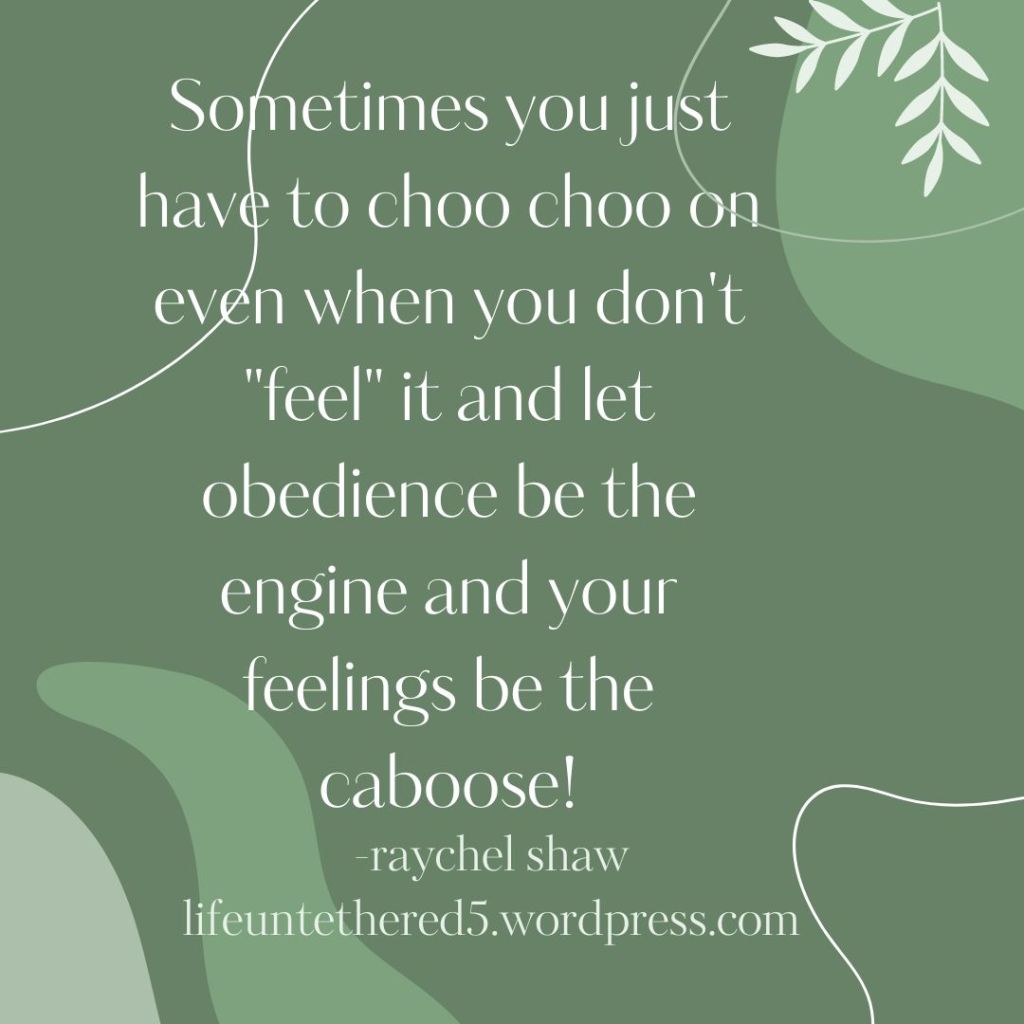 Sometimes you just have to choo choo on and let obedience be the engine and your feelings be the caboose. There’s some days I just don’t “feel” it, maybe because its difficult, maybe because it hurts, maybe because I’m tired, maybe because I’m lazy, but I still must respond to those days with the same level of commitment I “feel” on the good days when things are going swimmingly. I’ve experienced more than one day that I just wanted things to go back to the comfort and familiarity of the way they were, but I press on towards the goal and God gives me little affirmations (which I totally don’t deserve, and He doesn’t have to provide) along the way. Paul wrote in 1Corinthians Chapter 9:24-27 about self-discipline and running your race so as to obtain the prize.